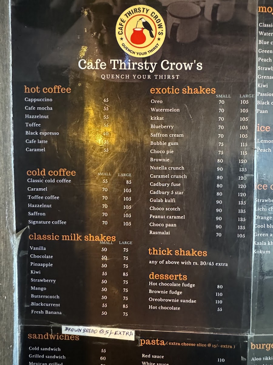 Customers rave about the quick service and high-quality food, particularly the unique garlic bread paired with exotic shakes. Whether you're grabbing a quick bite or lounging with friends, Cafe Thirsty Crow's blends taste with a laid-back atmosphere, making every visit a delightful experience.